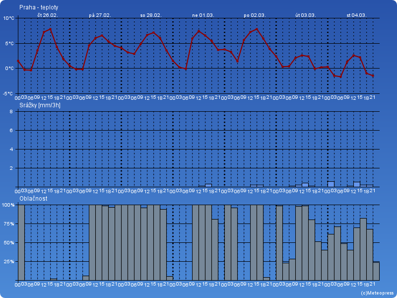 Oblačno až polojasno, občas déšť nebo přeháňky, v horských oblastech přechodně sněhové. Ke konci období přibývání oblačnosti a srážky četnější. Ranní teploty 4 až -2 °C. Denní teploty 5 až 12 °C.