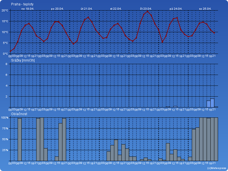 V neděli bude oblačno, občas přeháňky. Noční teploty 9 až 5 °C. Denní teploty 16 až 20 °C. Slabý severozápadní vítr.