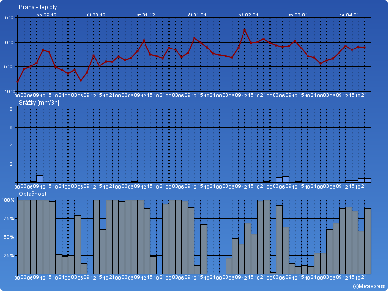 Většinou zataženo, místy slabé sněžení. Na Moravě a ve Slezsku polojasno až oblačno, ojediněle slabé sněžení. Nejvyšší teploty -4 až 0 °C, na východě až -6 °C. Teplota v 1000 m na horách kolem -8 °C. Slabý proměnlivý vítr do 4 m/s.