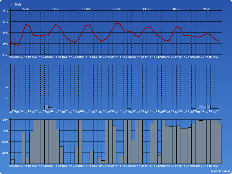 Denní teploty 4 až 8 °C. Jihozápadní vítr 3 až 7 m/s.