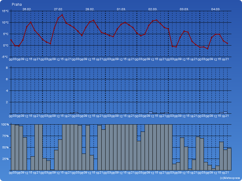 V neděli bude zataženo až oblačno, místy déšť. Noční teploty 3 až -1 °C. Denní teploty 7 až 11 °C. Jihovýchodní vítr 3 až 7 m/s.