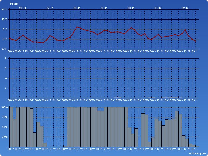 V pondělí bude polojasno až oblačno, místy nízká oblačnost. Noční teploty 2 až -2 °C, místy kolem -4 °C. Denní teploty 0 až 4 °C. Severozápadní vítr 2 až 6 m/s.