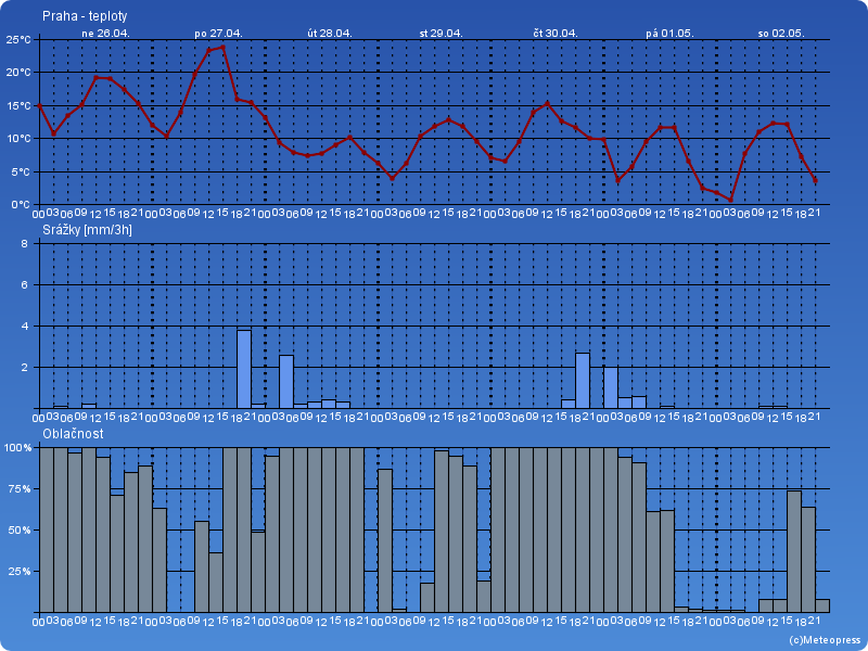 V pondělí bude polojasno, od západu postupně oblačno až zataženo, odpoledne a večer místy déšť nebo bouřky. Nejvyšší teploty 20 až 24 °C. Teplota v 1000 m na horách kolem 15 °C. Mírný jihovýchodní vítr.