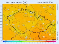 Včera postupovala přes naše území výrazná studená fronta, která přinesla hlavně na Vysočinu a do východních Čech silné bouřky a vydatné srážky. Na některých místech spadlo kolem 80 mm, na Podorlicku dokonce i kolem 100 mm vody!! V důsledku toho došlo k přechodným vzestupům malých toků, silný nárazovitý vítr působil materiální škody (více na http://www.katastrofy.com/scripts/index.php). V nočních hodinách fronta rychle ustoupila k východu a ve výběžku vyššího tlaku vzduchu se vyjasňovalo. Už zítra však čekáme další studenou frontu, která by však neměla být tak výrazná a silnější bouřky se neočekávají. Pronikne k nám však chladnější a vlhčí vzduch od západu – proto musíme v dalších dnech počítat se zvětšenou oblačností, občasnými srážkami a nižšími teplotami (ve čtvrtek jen kolem 17 st.).