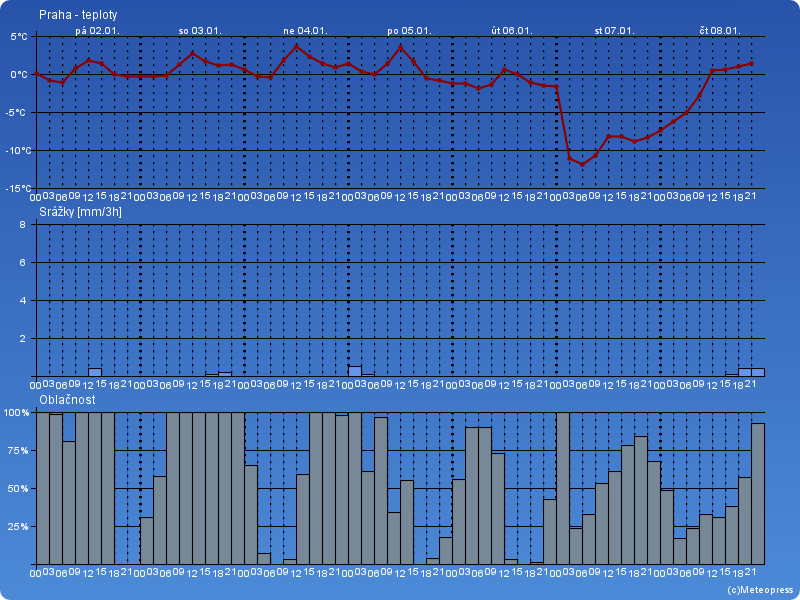 Ve čtvrtek bude oblačno až polojasno. Noční teploty -4 až -8 °C. Denní teploty -4 až 0 °C. Severozápadní vítr 2 až 6 m/s.