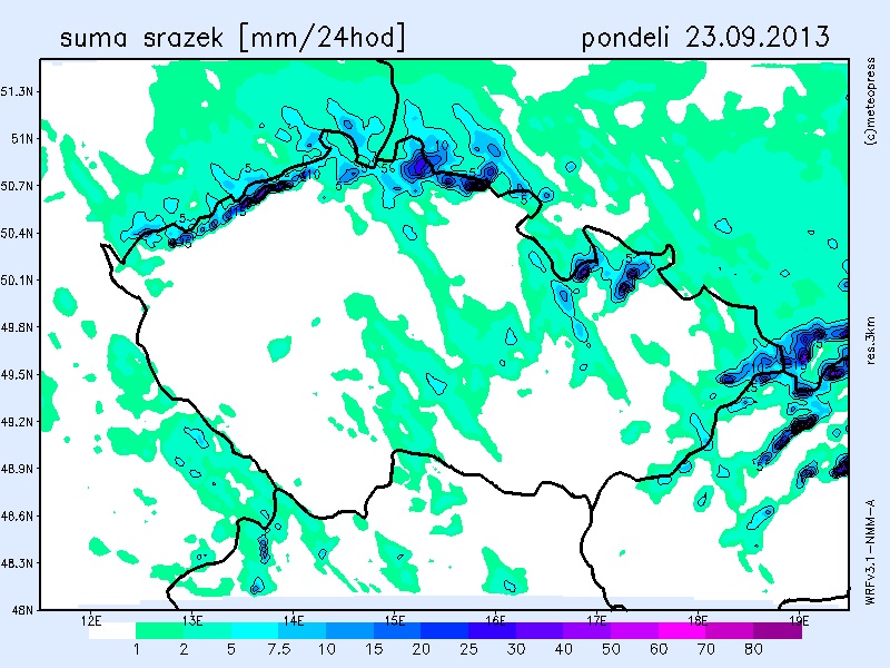 Do střední Evropy se během víkendu začal konečně rozšiřovat výběžek vyššího tlaku vzduchu, který přinesl ustávání srážek a protrhávání oblačnosti. V pondělí bude méně oblačnosti v Čechách – polojasno až oblačno, na východě území oblačno až zataženo a místy přeháňky. Nejvyšší teploty 15 až 19 °C. Teplota v 1000 m na horách kolem 10 °C. Čerstvý severozápadní vítr 4 až 9 m/s, místy s nárazy kolem 15 m/s.