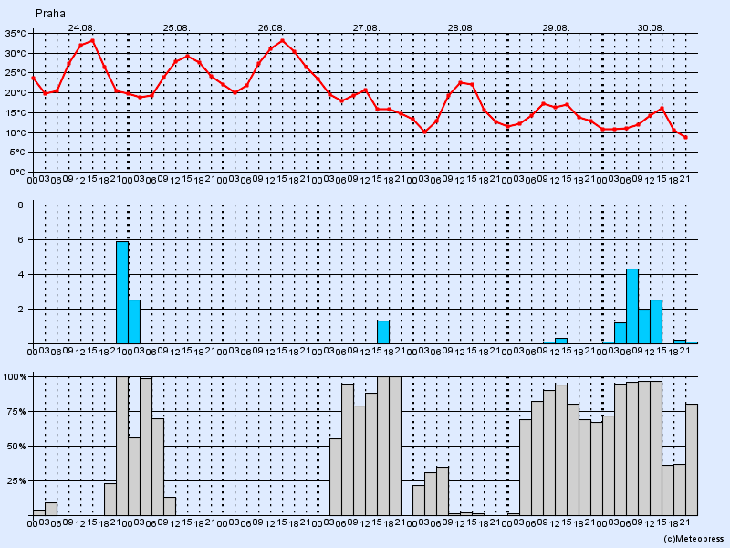 Jasno nebo skoro jasno, ojediněle přeháňky nebo bouřky. Postupně od západu přibývání oblačnosti se srážkami a bouřkami. Noční teploty 21 až 17 °C. Denní teploty 32 až 36 °C. Jihovýchodní vítr 2 až 6 m/s.