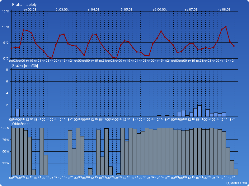V pondělí bude oblačno až zataženo, občas přeháňky, nad 600 m srážky smíšené nebo sněhové. Nejvyšší teploty 5 až 9 °C. Čerstvý západní vítr.