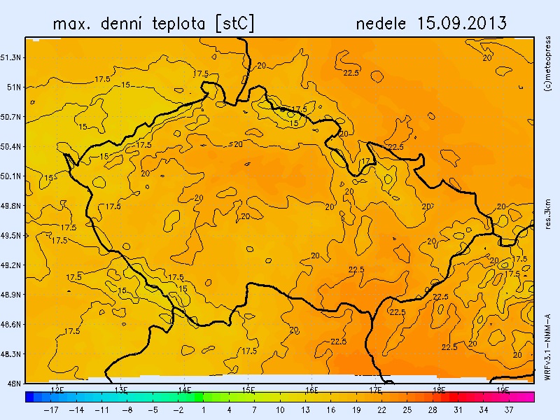 Neděle přinese teploty nejčastěji do 22 °C – v maximech naměříme 15 až 22°C. Teplota v 1000 m na horách se bude pohybovat kolem 10 °C. Teplotní rekordy padat nebudou.