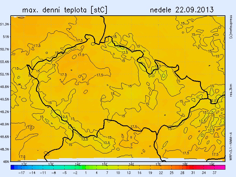 Neděle přinese teploty nejčastěji do 18 °C – v maximech naměříme 14 až 18°C. Teplota v 1000 m na horách se bude pohybovat kolem 10 °C. Teplotní rekordy padat nebudou.