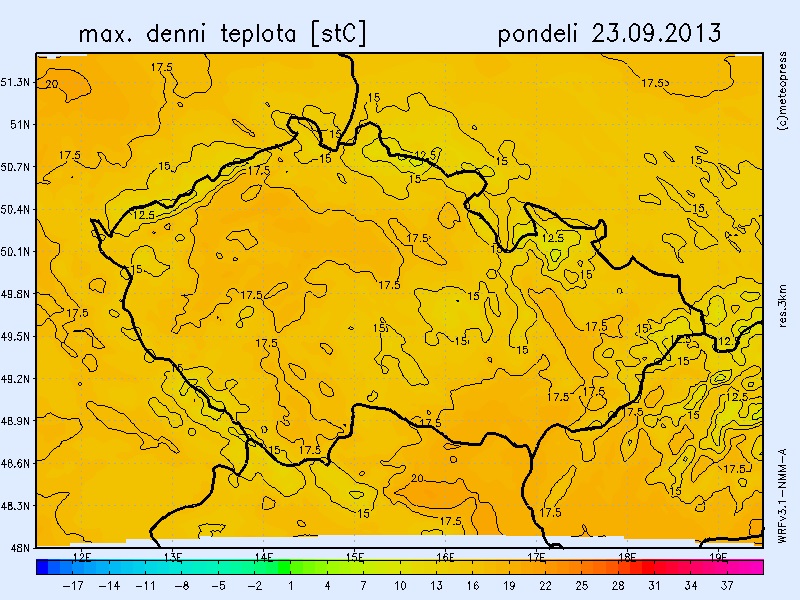 Pondělí přinese teploty nejčastěji do 19 °C – v maximech naměříme 15 až 19°C. Teplota v 1000 m na horách se bude pohybovat kolem 10 °C. Teplotní rekordy padat nebudou.