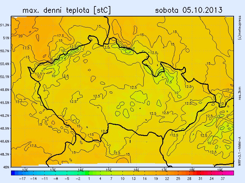 Sobota přinese teploty nejčastěji do 15 °C – v maximech naměříme 11 až 145°C. Teplota v 1000 m na horách se bude pohybovat kolem 7 °C. Teplotní rekordy padat nebudou.