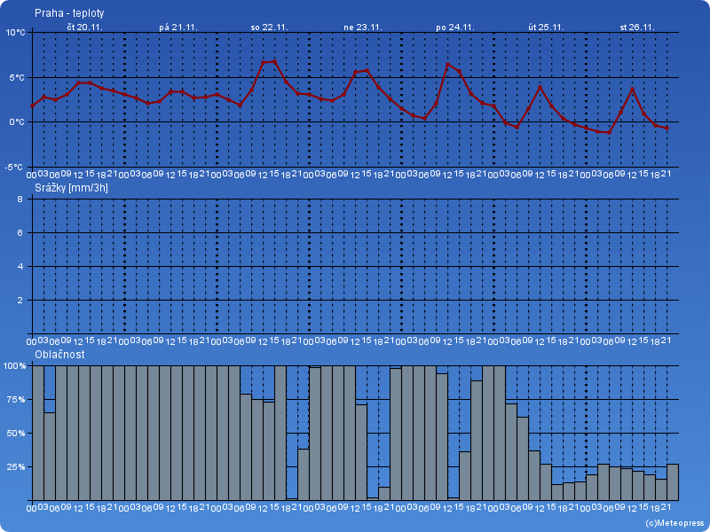 Oblačno až zataženo, občas přeháňky – zpočátku přechodně, postupně od středních poloh smíšené nebo sněhové. Ranní teploty 2 až -6 °C. Denní teploty -3 až 4 °C.