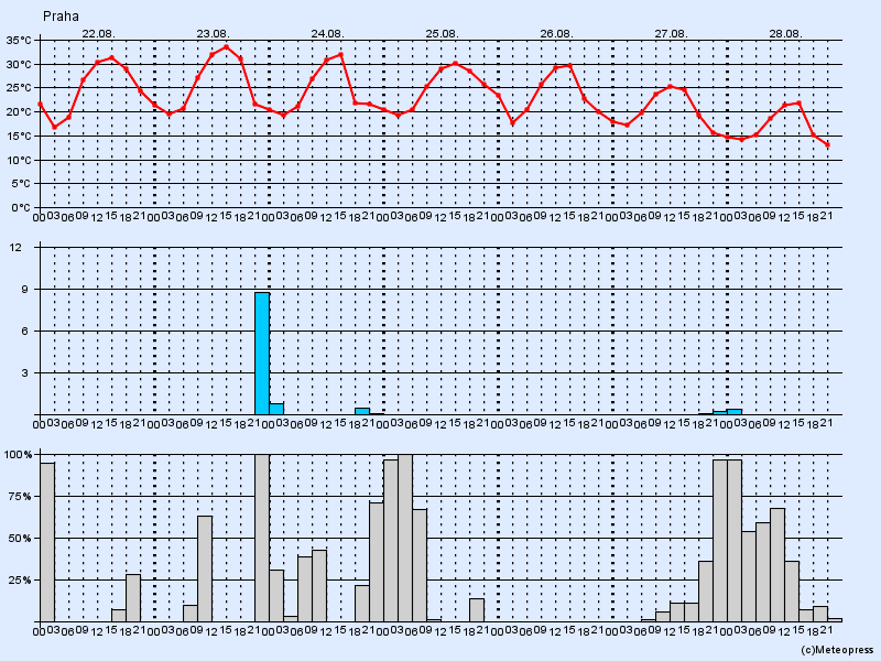 Do střední Evropy bude po celý pracovní týden proudit velmi teplý vzduch od jihozápadu až jihu. Nejvyšší odpolední teploty se budou zastavovat přes 30 °C. U nás budou nejteplejšími dny středa a čtvrtek s odpoledními teplotami mezi mezi 30 až 34 °C, a pátek s 35 °C. Na Slovensku očekávají v maximech až 35 °C, ve Švýcarsku 33 °C, v Rakousku 34 °C, v Německu 33 °C. V Evropě střední tak budou letos v létě konečně poprvé panovat teploty srovnatelné s teplotami ve Středomoří.