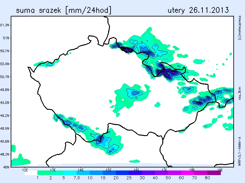 Druhý pracovní den posledního listopadového pracovního týdne přinese počasí jako přes kopírák s pondělím. Bude proměnlivá oblačnost, ojediněle sněhové přeháňky. Nejvyšší denní teploty -2 až +2 °C, na jihovýchodě až +4 °C. Teplota v 1000 m na horách kolem -5 °C. Mírný severozápadní vítr 2 až 6 m/s, na Moravě a ve Slezsku čerstvý severní 4 až 9 m/s, od vyšších poloh s nárazy kolem 15 m/s.