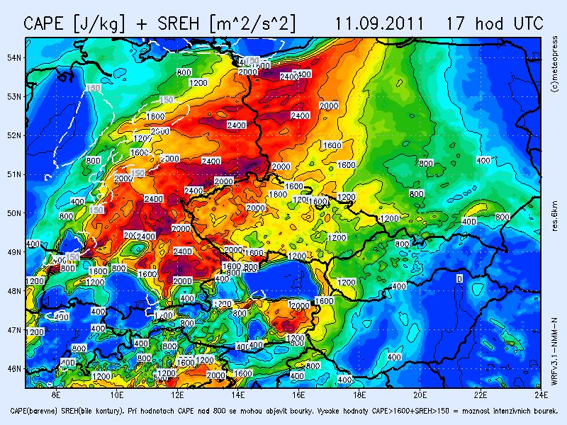 Teplé jihozápadní proudění ukončí studená fronta, která z Německa postoupí na naše území během nedělního večera. Pozor! Na frontě se mohou ojediněle vyskytnout silné bouřky, doprovázené krupobitím, přívalovým deštěm o intenzitě kolem 30 mm a nárazy větru kolem 75 km/h.