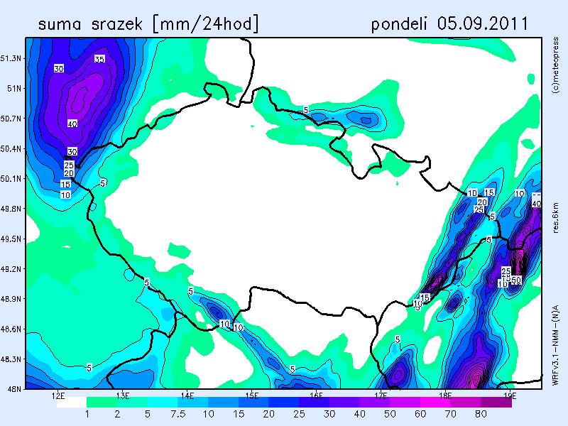V pondělí čekáme oblačno až zataženo s občasným deštěm nebo přeháňkami, místy bouřky. Na Moravě a ve Slezsku zpočátku dne ještě polojasno. Nejvyšší teploty 21 až 25 °C, na Moravě a ve Slezsku až 28 °C. Teplota v 1000 m na horách kolem 18 °C. Mírný západní vítr 3 až 7 m/s, v bouřkách bude zesilovat.