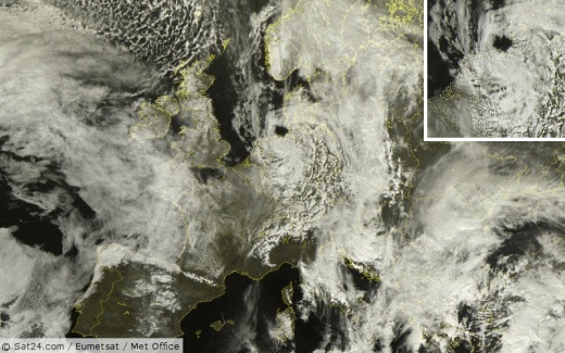 Jen pro zajímavost: Nad německou částí Severního moře byl k vidění „hurikán“. Nešlo však o hurikán jako takový, tlaková níže zde úřadující si pouze trochu pohrála s tvorbou oblačnosti a výsledkem byl vznik „okna“ v jejím srdci. To sice krátce na to zmizelo, přesto se ale jednalo o menší „zpestření“ evropského vzdušného prostoru. Něco podobného, avšak v mnohem menším měřítku, bylo třeba před několika lety k vidění i nad východem České republiky. Z pohledu ze země ale samozřejmě tato „hurikánová“ formace mraků zřetelná není.