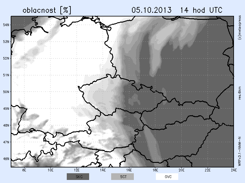 Víkendové počasí přinese přechodně více oblačnosti do Čech, kde se bude rozpadat okluzní fronta. Teplota ale půjde nahoru. V sobotu bude jasno až polojasno, na západě během dne oblačno až zataženo. Ráno ojediněle mlhy nebo nízká oblačnost. Nejvyšší teploty vystoupí na 11 až 15 °C. Foukat bude mírný jihovýchodní vítr o rychlosti 2 až 6 m/s, v horských oblastech čerstvý 4 až 9 m/s s nárazy kolem 15 m/s. V neděli bude oblačno až zataženo, ojediněle slabý déšť. Jen přechodně polojasno. Denní teploty vystoupí na 12 až 16 °C. Vítr zeslábne a změní se na východní o rychlosti do 4 m/s. Teplota v 1000 m na horách se bude pohybovat kolem 7 °C.