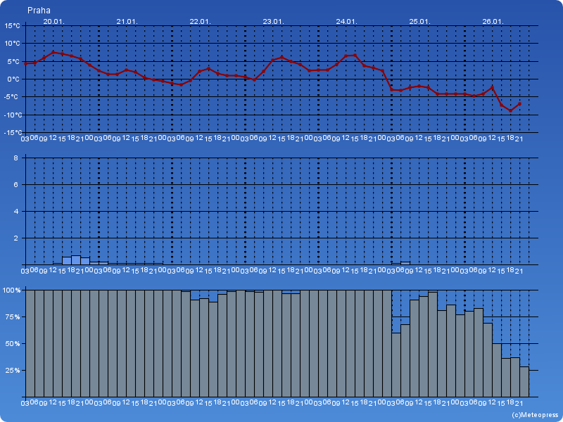 Převážně velká oblačnost – zataženo až oblačno, místy občasné sněžení, zpočátku přechodně i déšť, nebo déšť se sněhem nebo mrznoucí srážky. Noční teploty 0 až -6 °C. Denní teploty -4 až +1 °C, zpočátku období 1 až 5 °C.