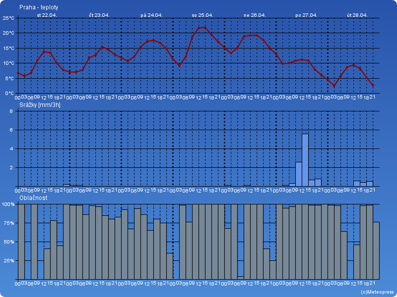 Ve čtvrtek bude polojasno až oblačno, ojediněle déšť nebo přeháňky. Nejvyšší teploty 15 až 19 °C. Teplota v 1000 m na horách kolem 11 °C. Slabý proměnlivý vítr.