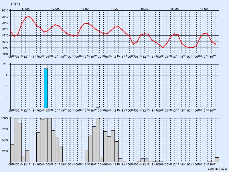 Oblačno, místy přeháňky. Noční teploty 15 až 11 °C. Denní teploty 17 až 21 °C. Západní vítr 3 až 7 m/s.