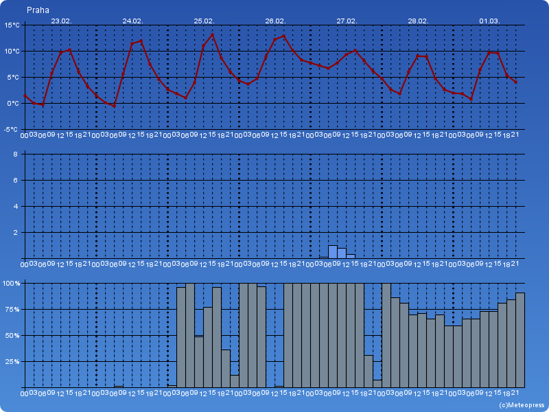 Ve čtvrtek bude oblačno až zataženo nízkou oblačností, místy polojasno. Nejnižší teploty 4 až 0 °C, při malé oblačnosti až -2 °C. Nejvyšší teploty 5 až 9 °C, při malé oblačnosti až 12 °C. V 1000 m na horách kolem 4 °C. Slabý jižní až jihozápadní vítr 1 až 4 m/s.