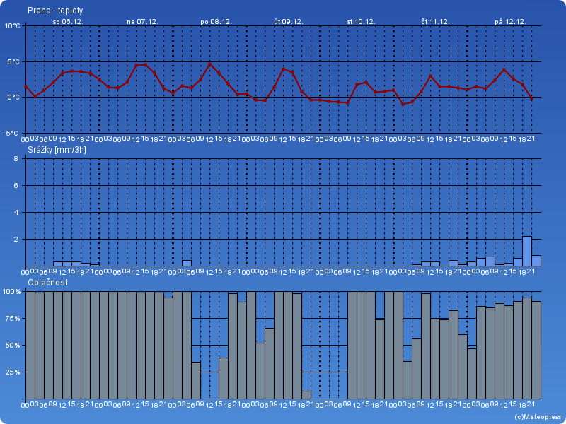 oblačnosti. Nejvyšší teploty 1 až 5 °C. Teplota v 1000 m na horách kolem -1 °C. Mírný severozápadní vítr 2 až 6 m/s.