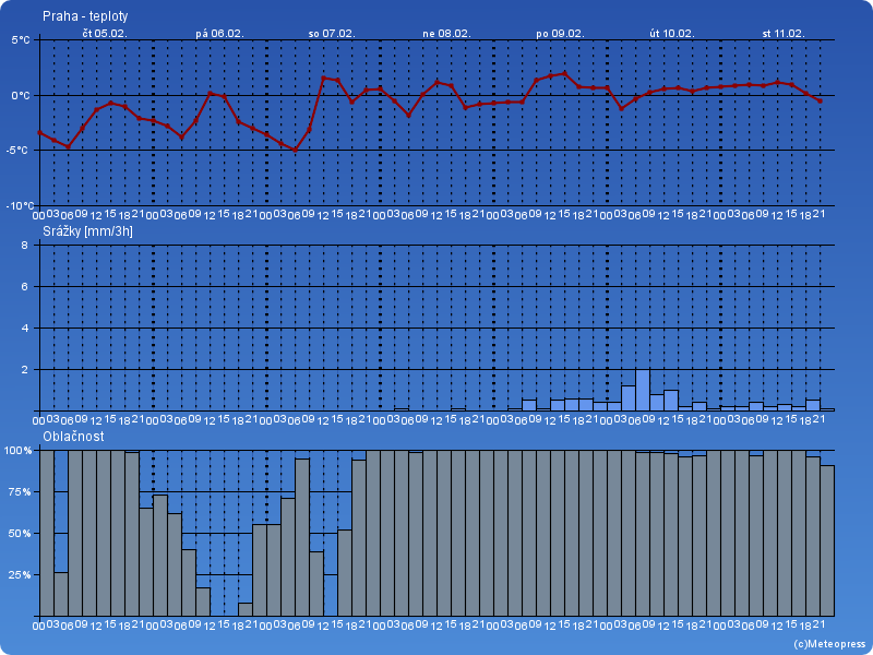 Ve čtvrtek bude jasno až polojasno. Místy mlhy. Noční teploty 0 až -4 °C, místy -8 °C. Denní teploty -2 až 2 °C. Jihozápadní vítr 1 až 5 m/s.